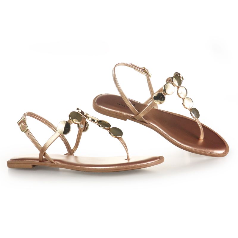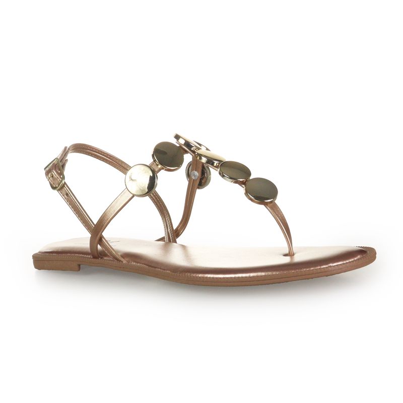 | Composição | Tirinhas em material sintético, esferas metálicas douradas, sola de borracha |