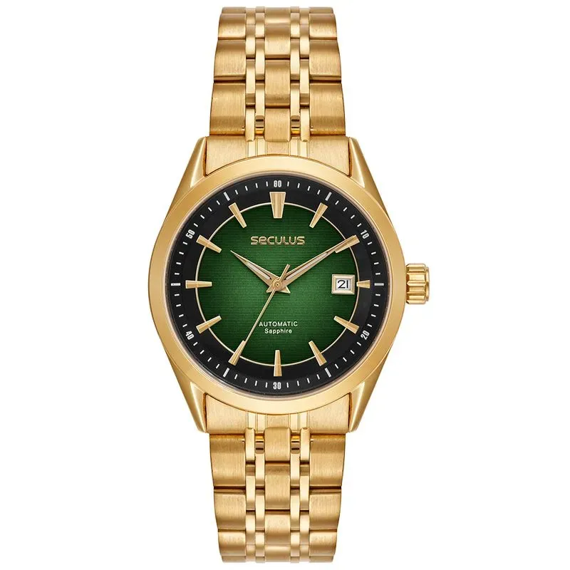 | Adicionais do Produto | Mecanismo automático, resistência à água, pulseira ajustável, acabamento dourado, design clássico |